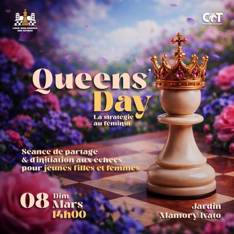 Le 8 mars 2026 à partir de 14h, la Ligue Analamanga des Échecs organise l’événement Queens’Day au Zaridaina Mamory Ivato, en collaboration avec CCT Chess Club Talatamaty.